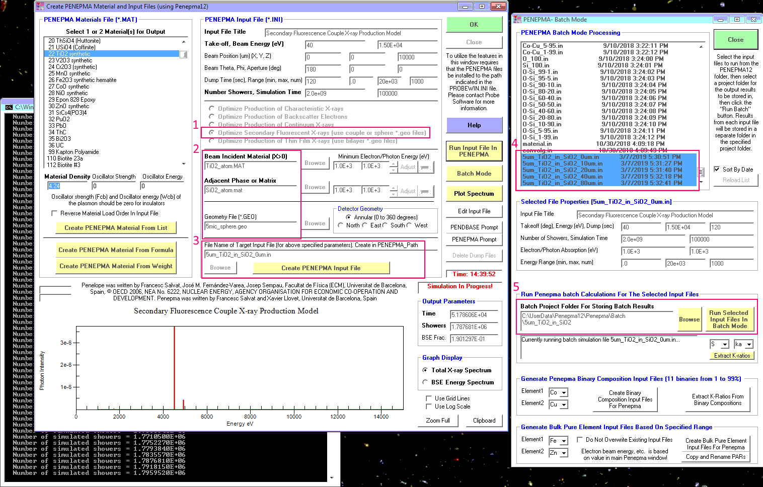 For ultimate accuracy one should utilize the full Penepma Monte Carlo code GUI, because it can handle any boundary geometry, though it does take a lot longer. However one can create a bunch of input files that can be run as a batch. This is this the GUI window running the full Penepma FORTRAN code, which is opened when clicking the Penepma Monte Carlo menu in Standard: