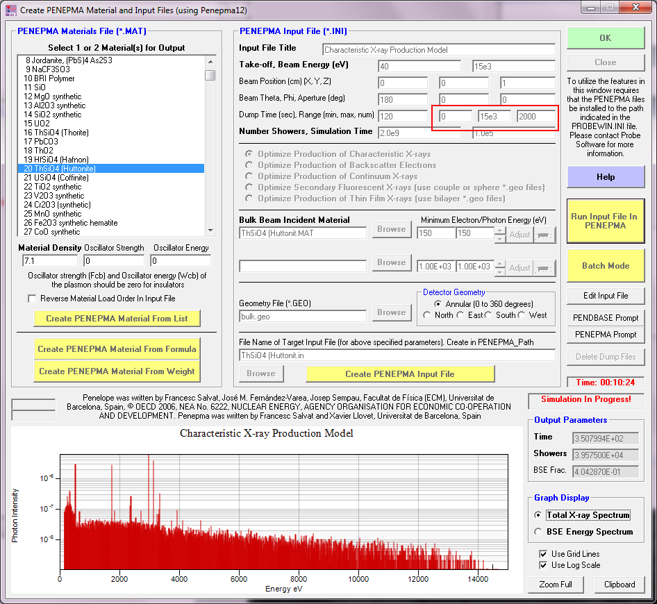In v. 11.7.2 of CalcZAF (and Standard) I added three new parameter fields to the Penepma GUI. These are for the minimum and maximum energy range and the number of energy channels.  This required a re-compile of the Penepma.f to allow for more than 1000 energy channels.