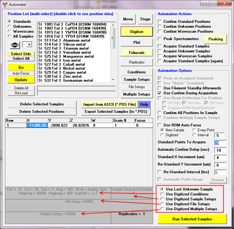 The conditions you have circled in the Automate! window are the "digitized conditions" parameters which are then assigned to the various positions samples for automatic acquisition with different conditions for different samples.  The display are actually "disabled" (more gray) to indicate that you haven't selected the "Use Digitized Conditions" option in the Automate! window.