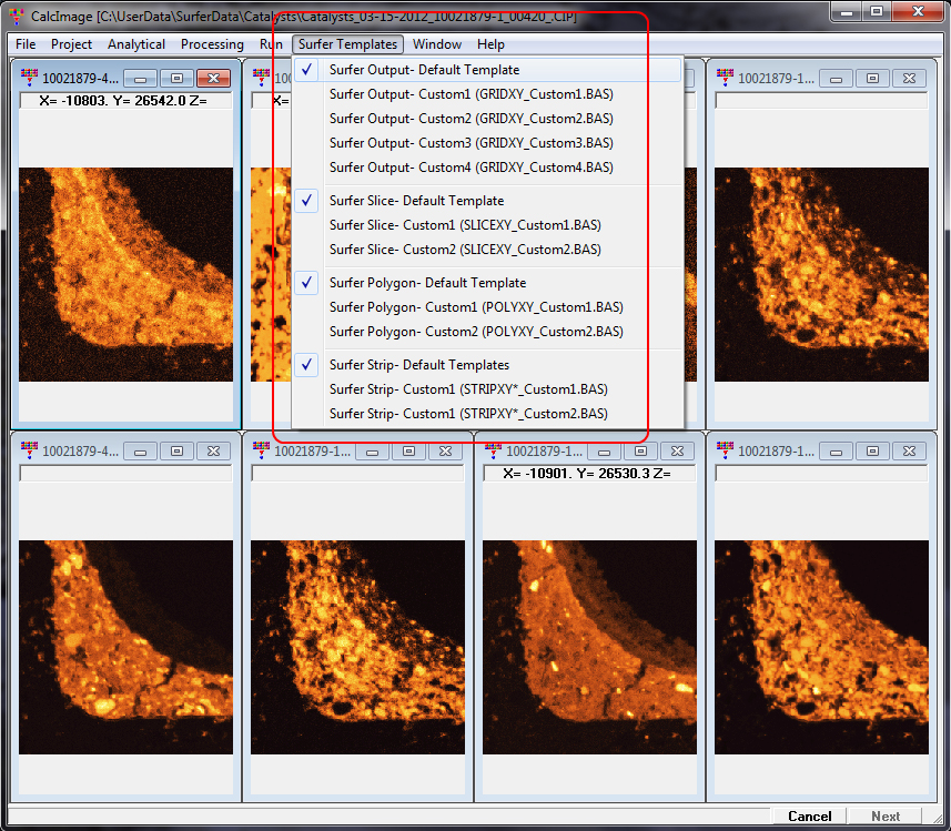 Once your modified scripts are renamed or edited you simply select them from the Surfer Templates menu as desired...