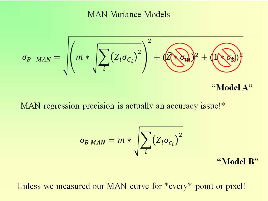 And you're right, once a set of MAN fit curves is established these will always return the same background intensity value for a given MAN. I'm not a statistician, but one could even argue that the MAN regression "variance" affects in fact accuracy and not precision, as it is more a measure of the scatter of the data points (so the fit might not be very reliable). But it might still be a valid measure of the error of the MAN background value, so could this variance propagated through to the background intensity? Just interested how large those uncertainties in the background intensities would be. Would that be as simple as using the calculated MAN regression variance (say 5% relative) for the background intensity?