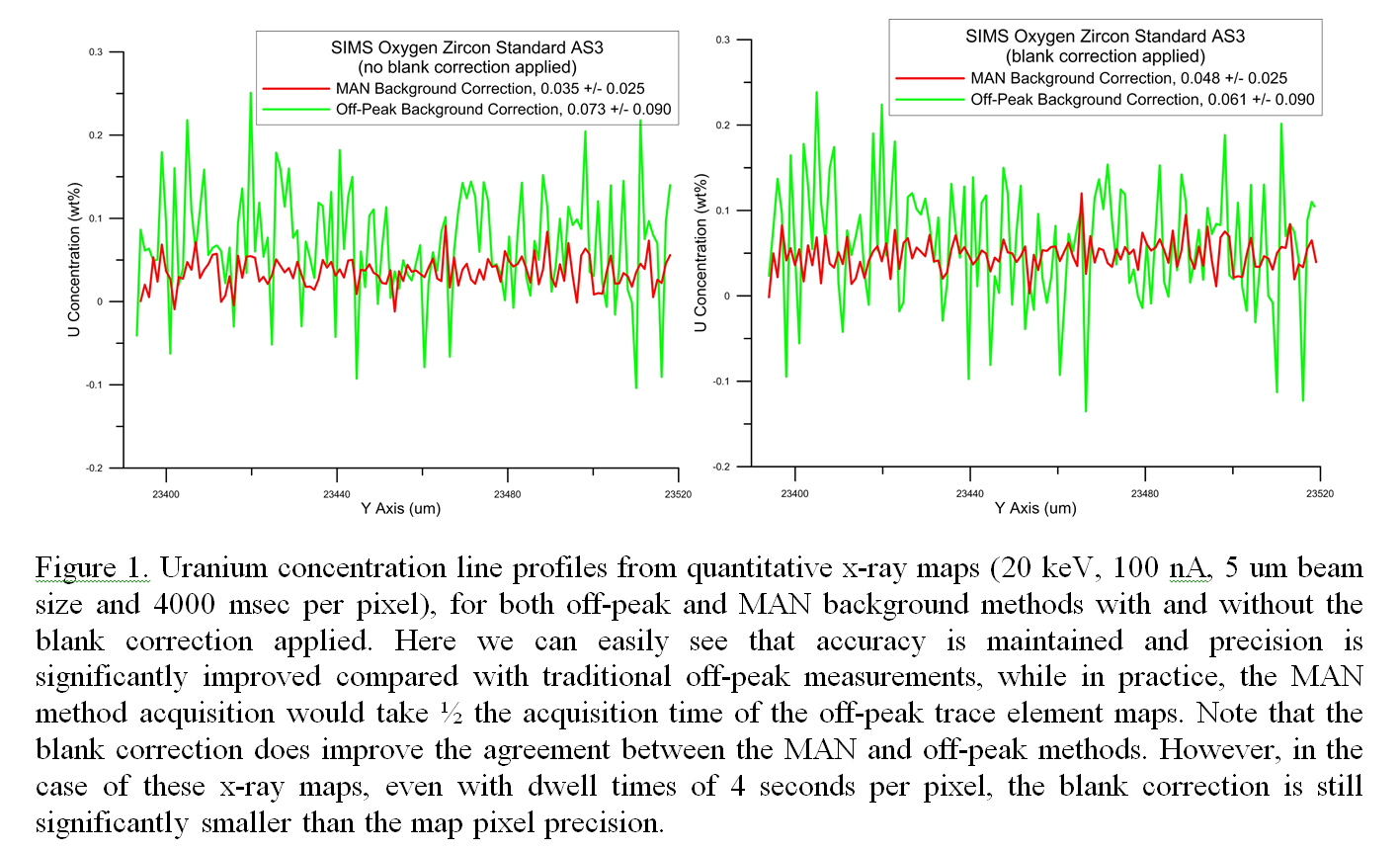 But keep in mind that for most oxides and silicates, the MAN method accuracy *without* the blank correction is around 100 to 200 PPM. That is to say, within the counting statistics variance for most situations of major and minor elements.