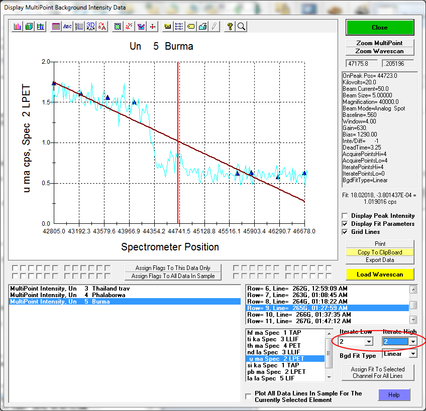 Fortunately we can modify the background fitting in post processing, and force the multi-point background to only use the background measurements on one side of the absorption edge to get a more accurate measurement of the intensity under the peak next to the Ar absorption edge: