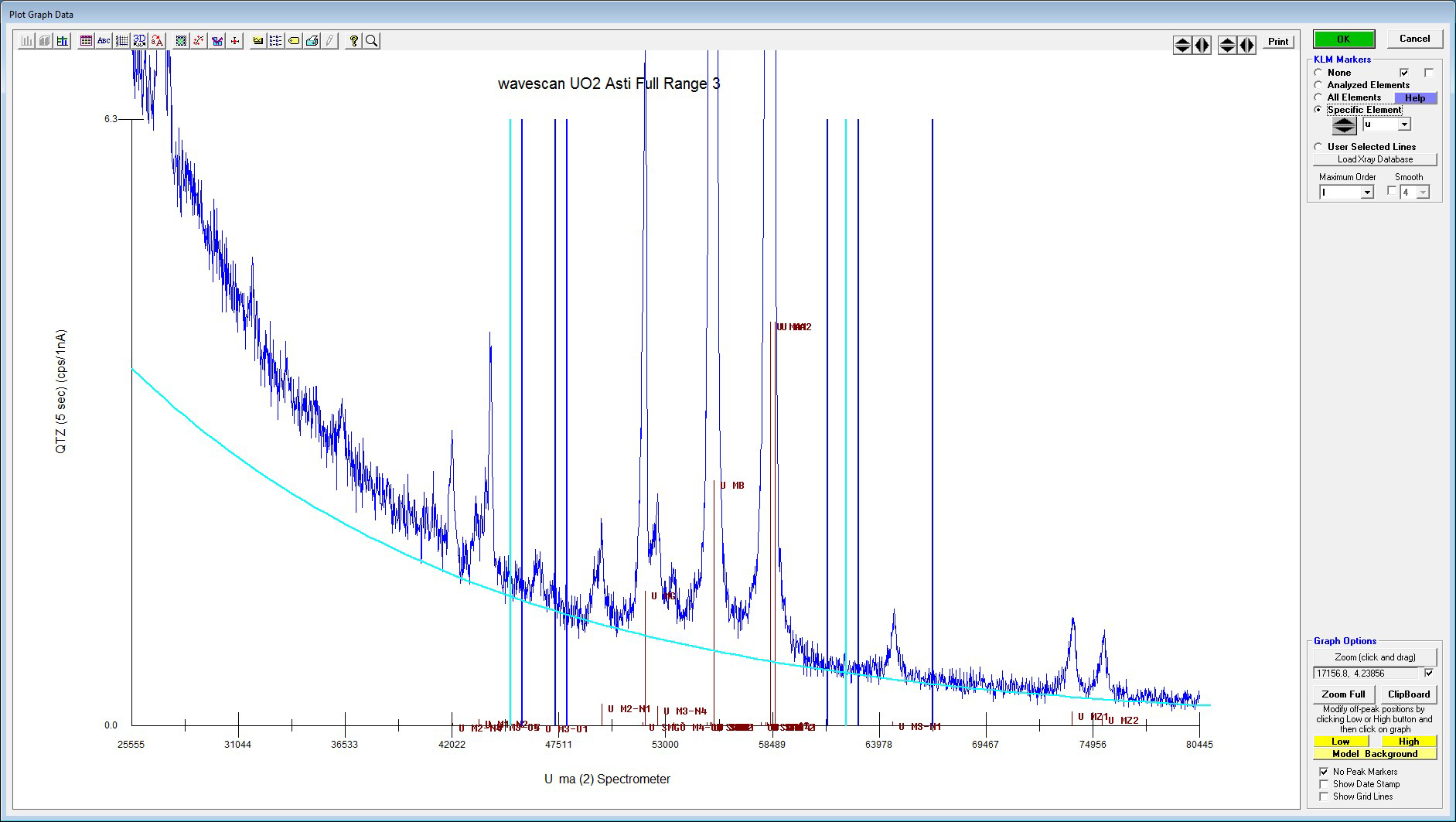 2) So wouldn't it be a good idea to use the multi point background method? Like shown in the image? I would measure the backgrounds left and right of the whole are of U M lines and put some exponential fit through. However, what about this absorption edge then? Imagine how this area looks like in a sample where we have U, Np, Pu, and Am. It's like the REEs, just worse. I think the multipoint option is the only reasonable approach, whatever there is with the absorption edge of Ar.
