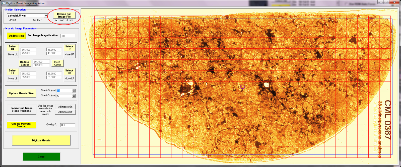 OK, I tweaked the interface some more as you will see, but the cool thing is that in addition to loading a stage map for mosaic imaging, one can now also load any calibrated image (currently just the two point calibration, soon both the 2 point and three point calibrations) from any source (e.g., a BSE image or thin section slide scanner),  for use as a "basemap" for selecting the mosaic area and the sub images using the new Browse button as seen here: