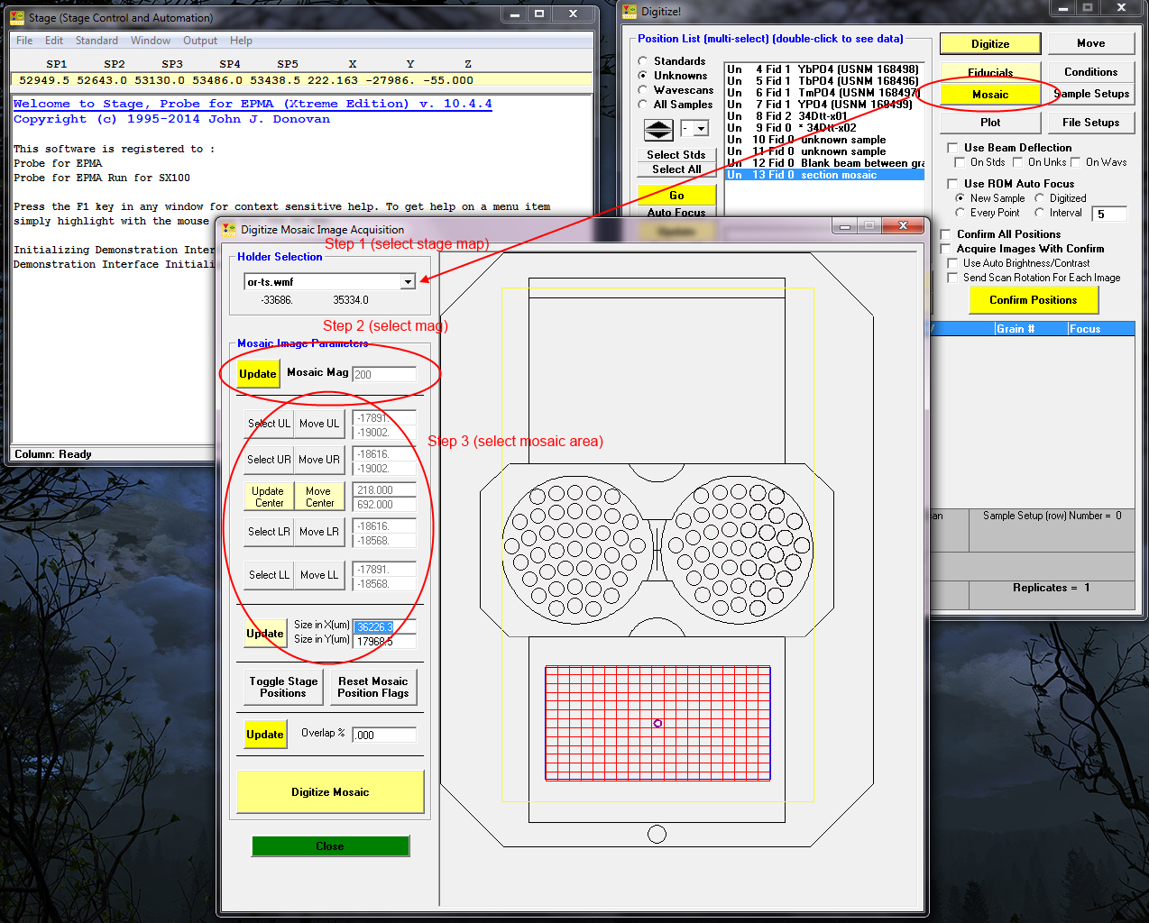 To begin, start the Stage.exe application by clicking the Stage menu in the Windows "Start" button Probe Software menu. JEOL 8230/8530 users please remember that only one application that connects to the instrument can be open at a time! Then once Stage.exe is up, click on the Mosaic button in the Digitize! window as seen here: