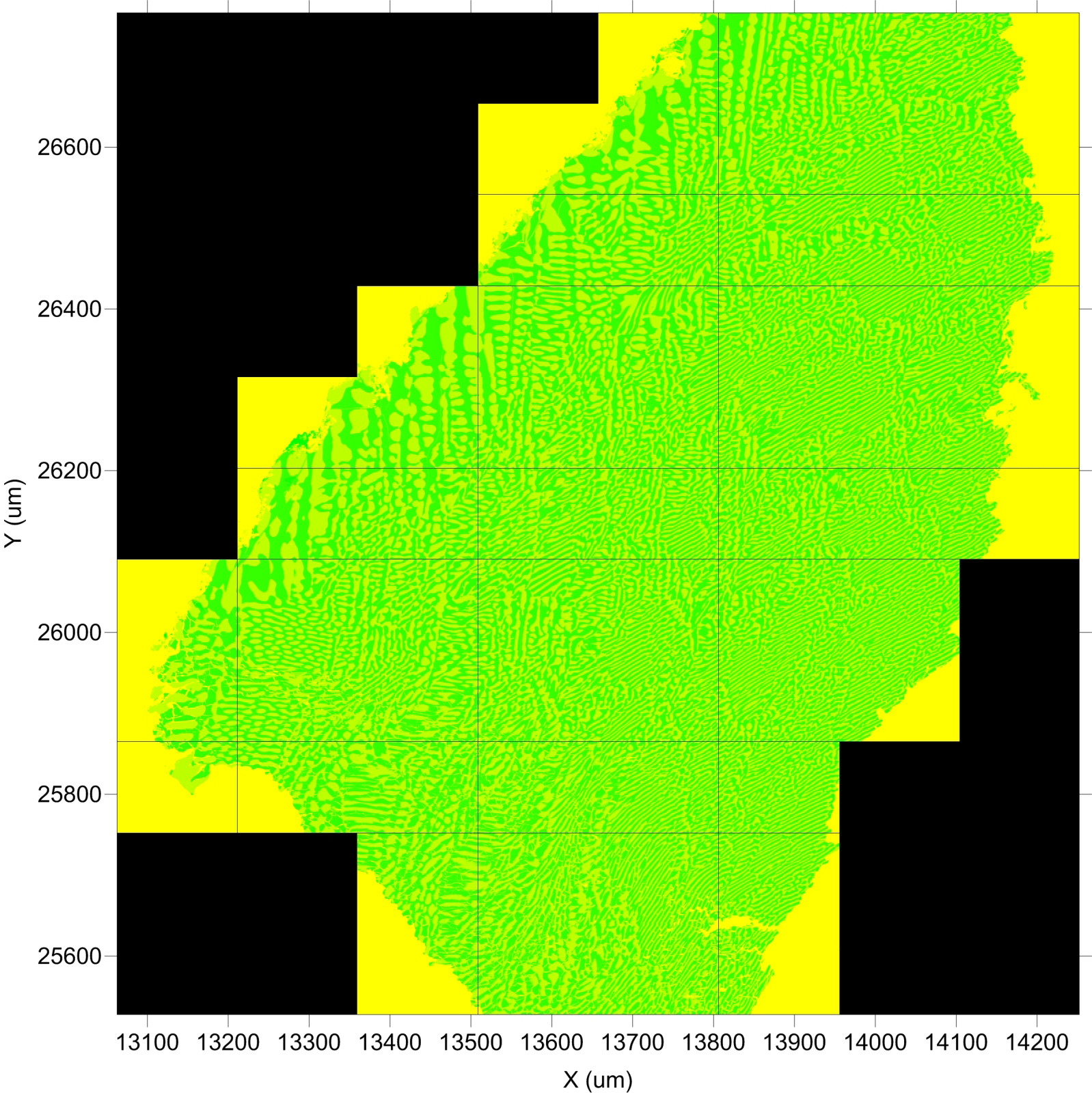 Also these sub images (512 x 384) were acquired with zero percent overlap. So by adjusting that slightly one could eliminate the 1 pixel gaps without having to improve the image beam scan calibration.
