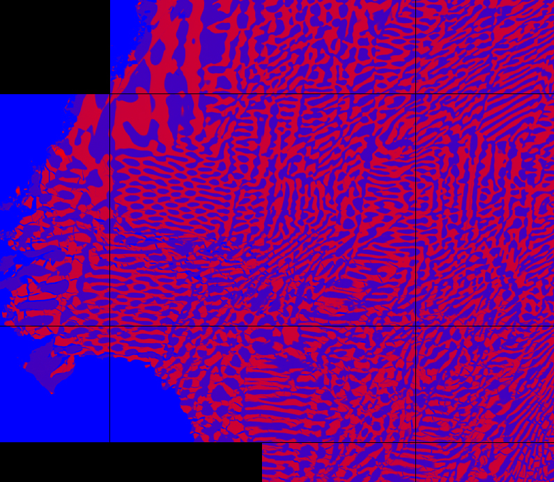 So here is a partial mosaic image of one of our standard blocks at 15 keV, BSE signal and 144 x sub image mag, because in the full size image one can't make out the pixel mismatch from the image calibration.