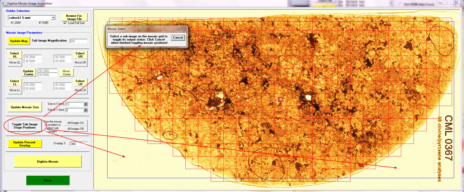 Then follow the steps to select the appropriate stage map, the mosaic magnification for the sub images and the extent of the total mosaic area as seen above. Next utilize the "toggle" tool to turn on or off specific sub images where you do not want to acquire a sub image as seen here: