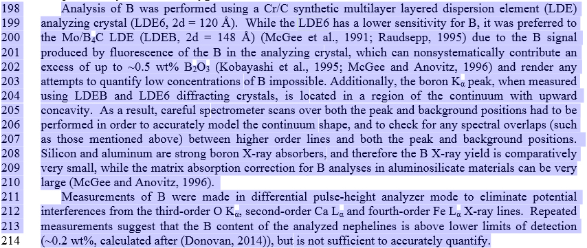 Rescans in a new MDB using the above info in the crystals.dat file gives Plot! KLM markers that fit very well on the LDE1 and LDE2 crystals, but the KLMs on the LDEB using 148.11 are still a little "off".  One thing I noted was a huge (2.6mm!) peak shift between BKa measured on B metal and BKa measured on BN.  The B metal gives a calculated d of 150.7, whereas the BN gives a calculated d of 148.72.  The latter is much closer to the values calculated from the higher order Ka peaks from Si, Al, Mg and O (using SiO2, Al2O3 and MgO), supplemented by various fluorides and pure metals (L lines....).