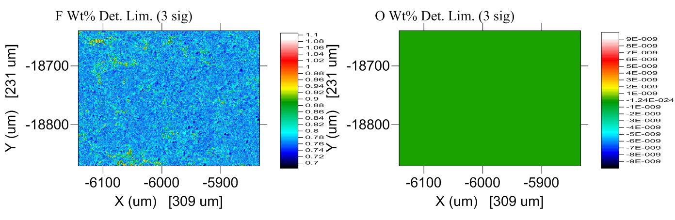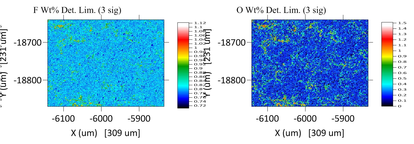 Now why did the F Ka detection limit map work, but not the O Ka map? Well, these maps were corrected using the MAN background correction, which eliminates the necessity of acquiring separate off-peak maps, which can double the map acquisition times. MAN background corrections, explained here: