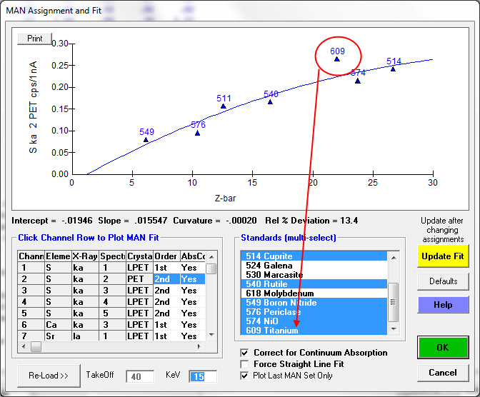 On an entirely different note, in the MAN fits, it is interesting that the Ti standard sometimes plots above the trend for sulfur Ka but on other spectrometers it does not: