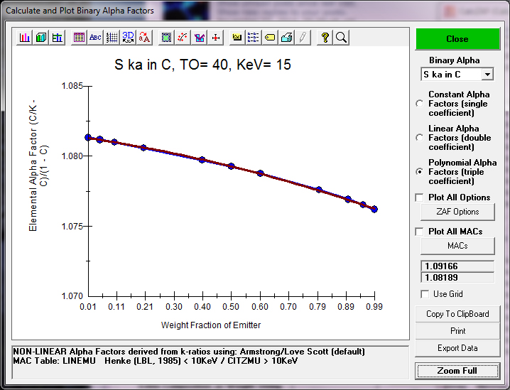 Are you trying to create a calibration curve?  I haven't calculated the S ka in C binaries using Penepma Monte-Carlo yet (though it would only take a weekend), but using the Analytical | Calculate and Plot Binary Alpha Factors menu here is the alpha versus concentration plot using CalcZAF defaults: