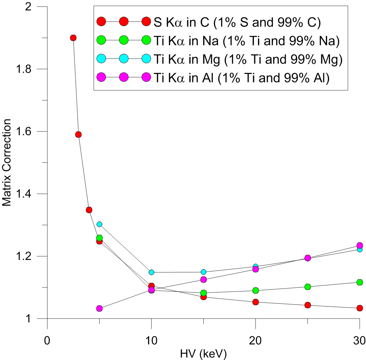 The C Ka matrix correction calculations at 5 keV are in almost perfect agreement (1.02), but yes the S Ka at 5 keV are a little different (1.24 vs. 1.16), and the physics is, as I said above, weird.