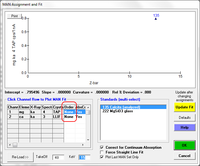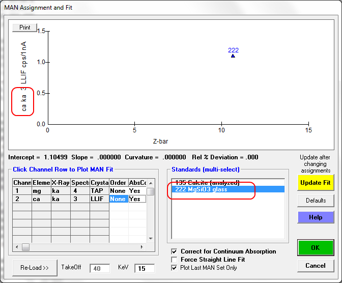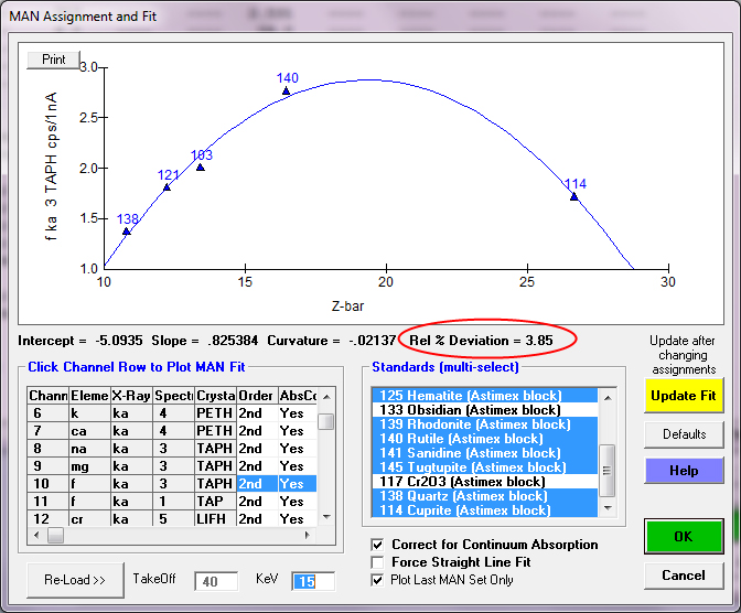 The basic "rule of thumb" (and it is merely a "rule of thumb" so there are exceptions!), is that since we are trying to characterize the continuum as a function of average atomic number, and background is, by definition, generally the lowest intensity we can measure, then any standard which plots "above" the fit as seen here, is a good candidate to <ctrl> click to unselect and update the MAN fit: