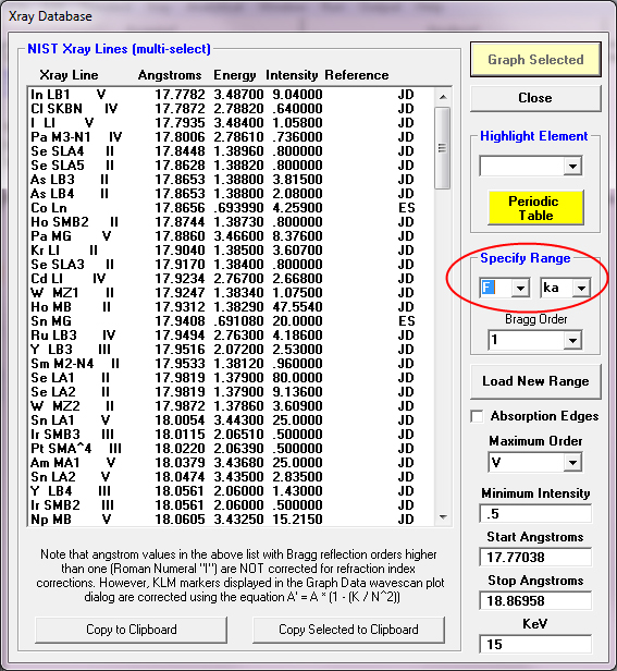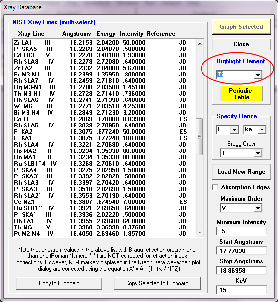 Note that the wavelength range was specified by entering F Ka in the Specify Range controls as seen above. Now to see if any Ti emission lines could in principle, interfere with the F Ka line, we can select an element to highlight, in the case Ti, by using the Highlight Element control as seen here: