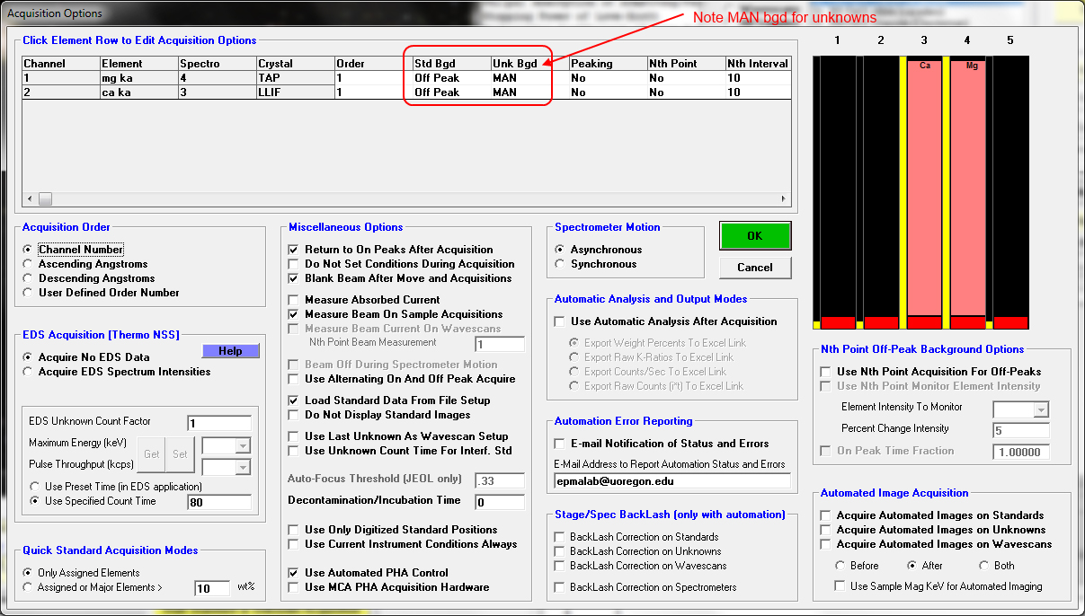 Let's start with adding Ca and Mg to a spectrometer and then go to the Acquisition Options dialog as seen here and specify that the standard acquisition use off-peak backgrounds but the unknowns (your dolomite point analyses or maps) use the MAN background. Here is the Acquisition Options dialog: