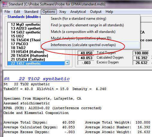 In either case no Ti lines are found near the analytical emission line for fluorine.  Another method which can provide a nominal estimate of the possible overlaps is by using the Options | Interferences menu in the Standard.exe app. Begin by selecting a the potentially problematic Ti standard or another similar standard such as synthetic TiO2 as seen here: