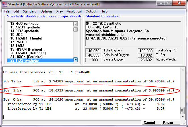 In other situations one might actually find that they have a trace element contamination in their standard that they were not aware of (Probe for EPMA automatically deselects all standards that contain any of the element of interest in the MAN fitting) and therefore that standard will also plot "above" the general trend. Therefore "contaminated" standards should also be deselected and the fit updated similarly as we did with the above apatite and Cr2O3 standards which interfere with F ka.