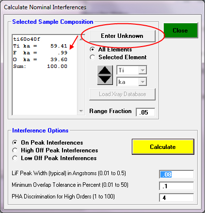 Now, using the Unknown button, add a small amount of fluorine to the material because the software only check for elements in the material as seen here: