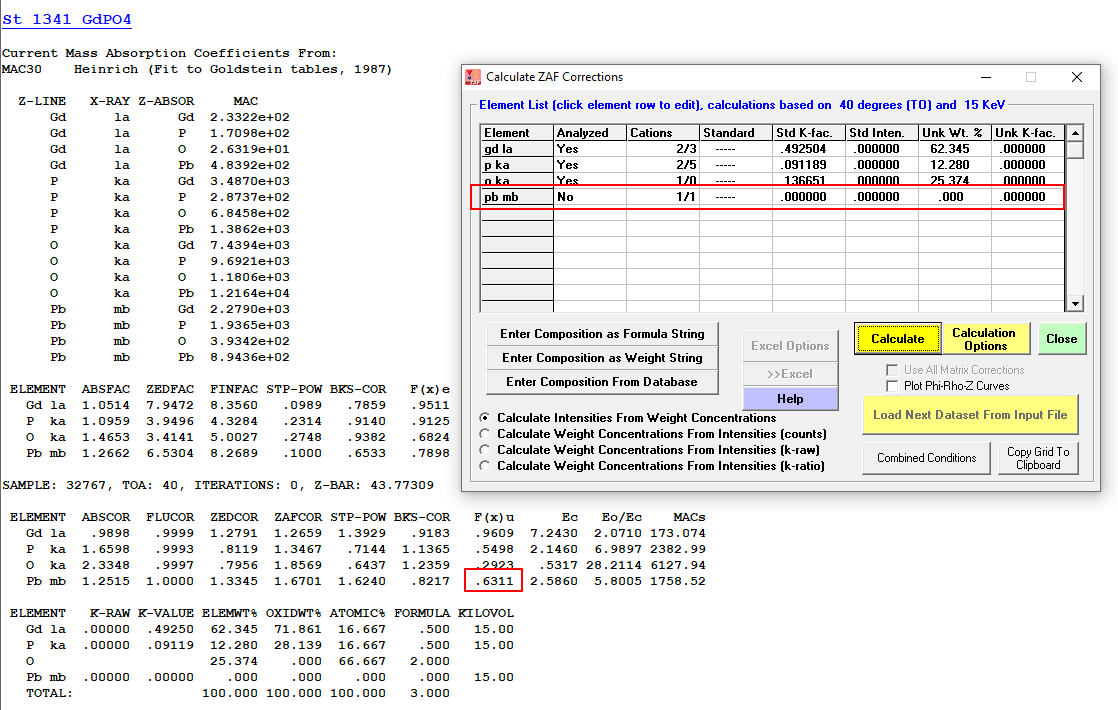 The approach of how to calculate the continuum absorption is mentioned in Ware and Reed (1973), which is referred in Donovan et al. (2016). However, for better understanding, I recommend a book "Scanning Electron Microscopy and X-ray Microanalysis" by Goldstein and co-workers and its electronic supplement, where the method of Philibert, Duncumb and Heinrich is explained in detail. At first, I tried to calculate their example on NiKa absorption in Ni-Fe alloy in Excel, then I got the same results in CalcZAF. Continuum absorption is calculated similar to the absorption of a characteristic line with the exception of zero concentration of the emitter in the former case. The values of f(chi), which is the fraction of the generated x-rays, which were not absorbed, can be simply and quickly calculated in CalcZAF. First of all I selected Philibert/Duncumb-Reed matrix correction and MAC table (Ware and Reed refer to Heinrich, 1966; however MAC's for PbMb are not published in this set – see below). Then, I loaded a standard from our dataset, e.g. GdPO4. Subsequently, I added PbMb line to the calculation with Pb concentration set to zero. After the calculation, the value of f(chi) for PbMb can be found in results. This approach seems to work well.