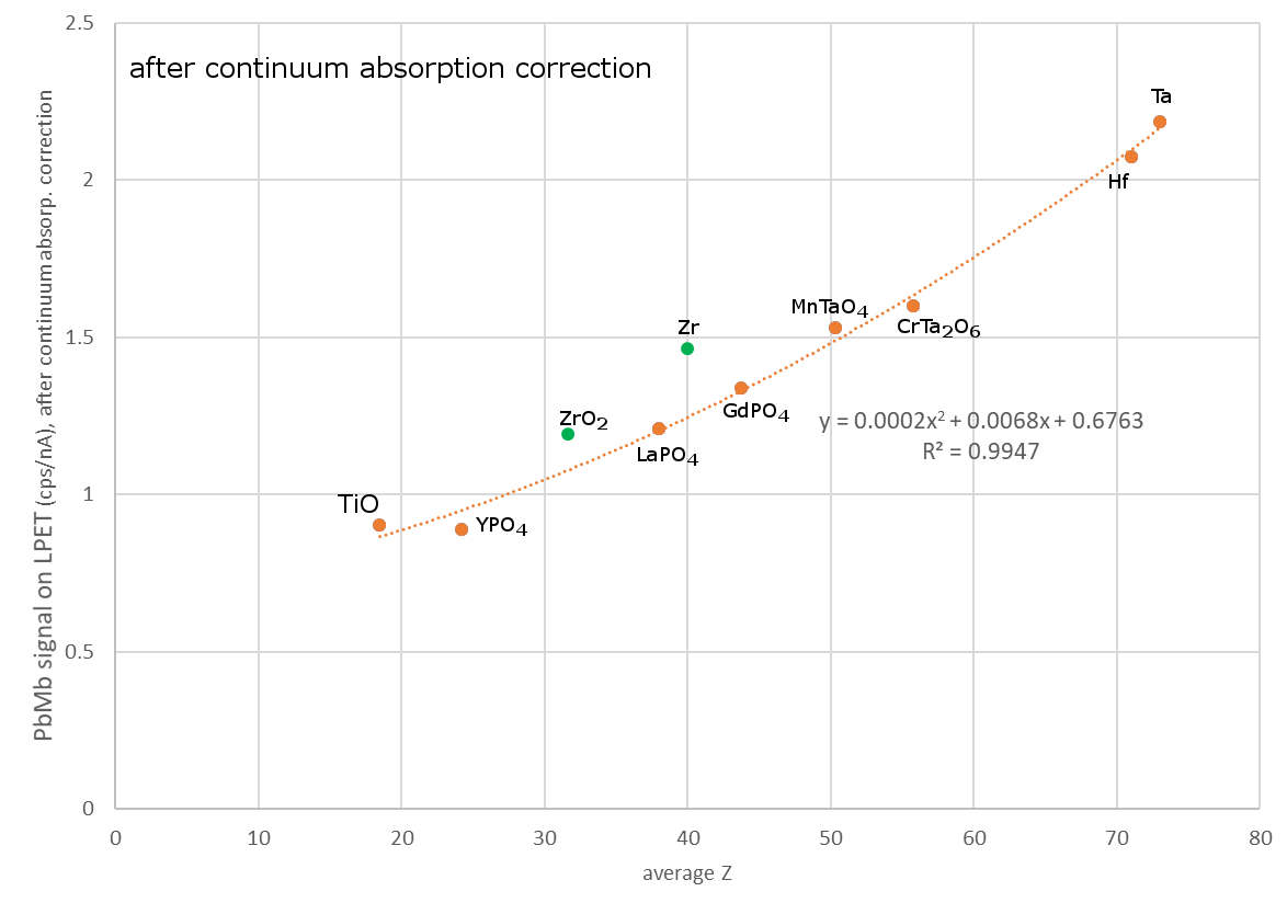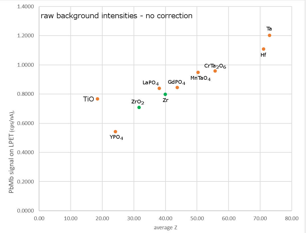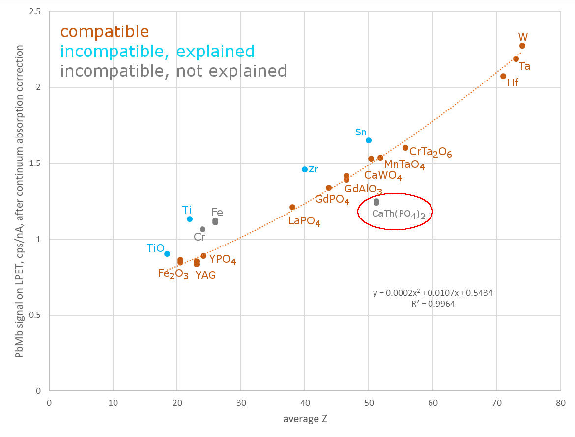 Very mysterious for me is the behaviour of cheralite, CaTh(PO4)2, intensity of which shows very deep "negative" anomaly. It has avg. Z of 51.158, but PbMb-intensity of only 1.24 cps/nA (based on 3 measurements). CaWO4 and MnTaO4 with very similar avg. Z give c. 1.53-1.54, which is the theoretical, MAN-curve-compatible, background value at that Z.