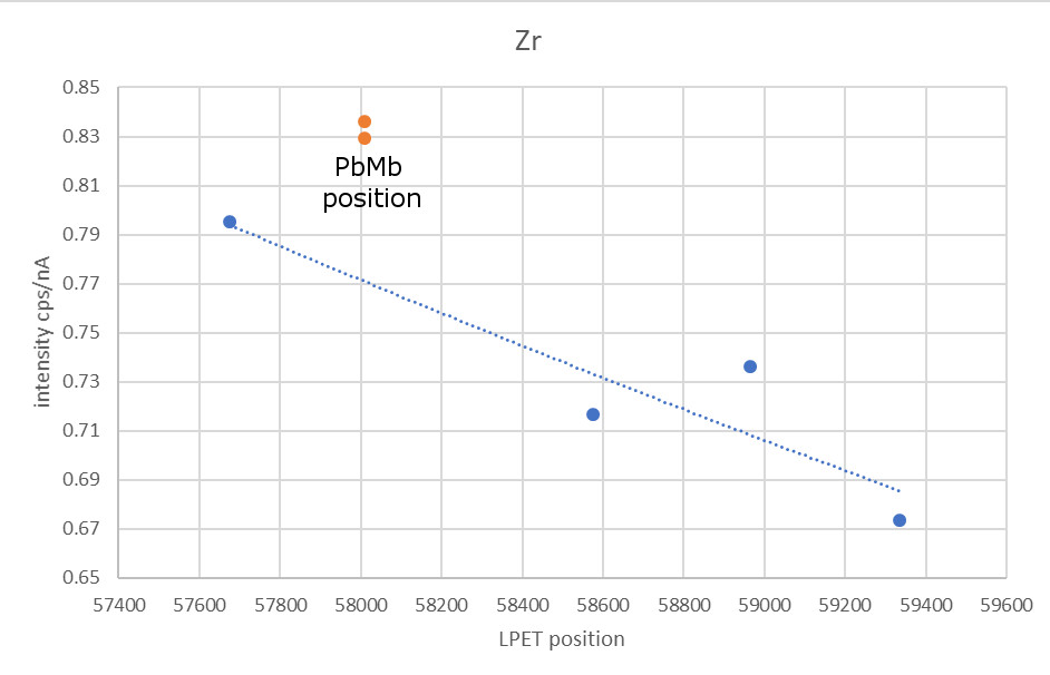 Somewhat enigmatic for me are the deviations of the two Zr-bearing standards, ZrO2 and pure Zr. I have studied a WDS scan of a wide region around PbMb performed on a pure Zr, but there should be absolutely no noticeable zirconium (or some contaminant) peak at that position – according to the scan as well as according to the x-ray spectral database. Any idea for this behaviour?