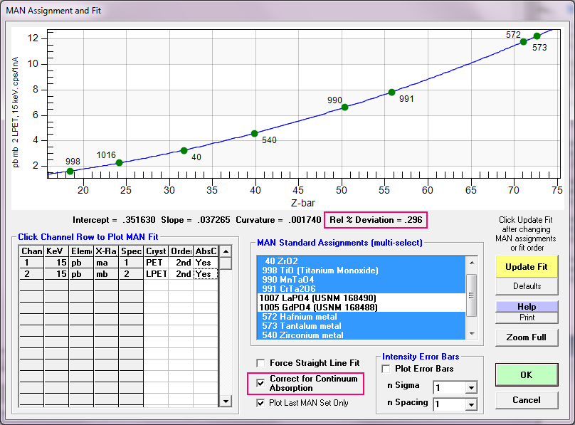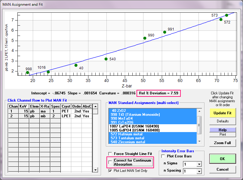 As to what continuum absorption correction is being utilized in Probe for EPMA for the MAN curve fit, it is whatever absorption correction is currently selected in the ZAF/Phi-Rho-Z method.  Originally we tried several absorption corrections specifically intended for continuum emissions, but we got worse results than just using the absorption corrections from the currently selected matrix correction.  So now the MAN method in PFE just uses the absorption correction from whatever matrix correction has been selected.