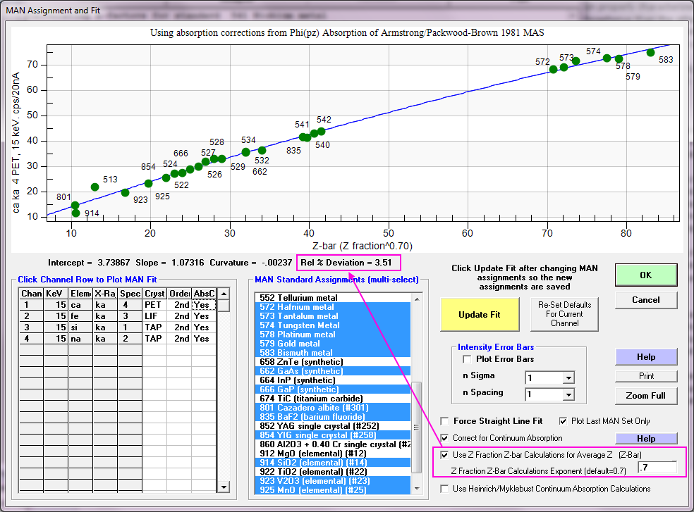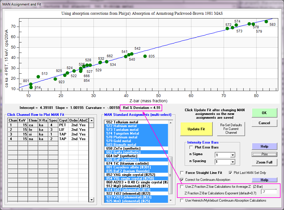 Just wanted to point out that the MAN fit calculations in the Assign MAN Fits dialog in Probe for EPMA can be modified to utilize the more physically accurate electron fraction or Z fraction averaging method. Of course, this only pertains to average Z calculations for compounds.