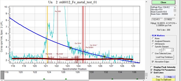 Zooming in on the background positions for the Co Ka, the exponential fit still over-estimates the background intensity underneath the Co Ka (as seen with a wavelength scan over the Co Ka in the Fe metal standard):