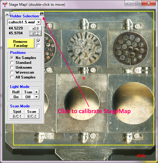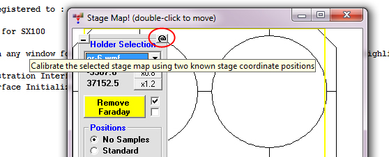 Currently one must edit the Probewin.ini file to add a new StageMap file and calibrate it. This editing and calibration process is roughly documented documented in the User Reference manual, but we will post a simple tutorial on this process soon... but the stage map calibration is easily performed using the "@" button in the StageMap window as seen here: