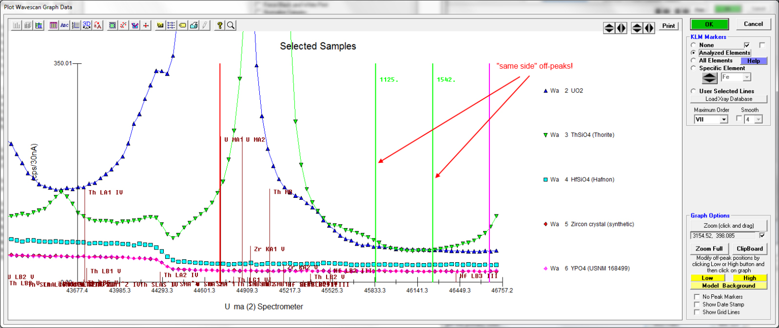 The new wavescan plotting routines are pretty nice for complicated backgrounds.  Here I've acquired wavescans on multiple standards for a trace zircon run: