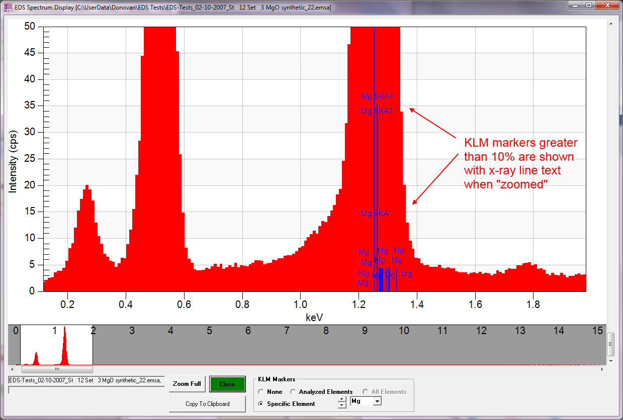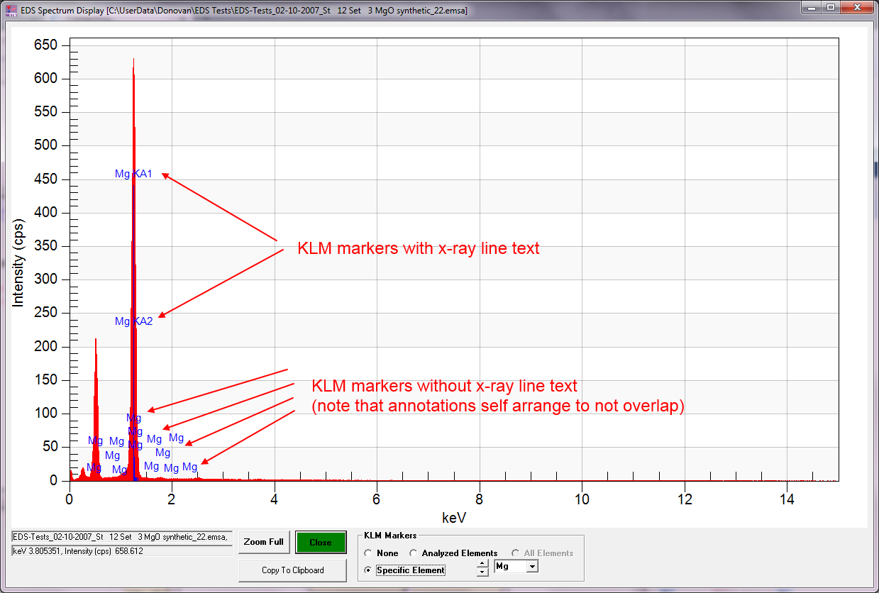 The new KLM markers are "dynamic" in the sense that the x-ray line text isn't loaded unless the marker height is more than 10% of the display height.  For example, here is a MgO spectrum with the KLM markers for Mg: