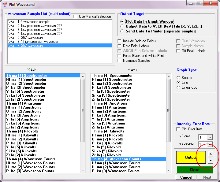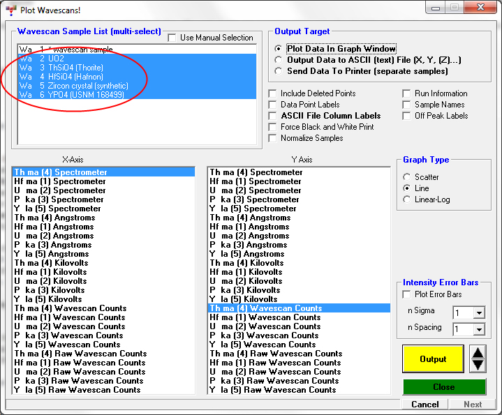 PS The plot/output window for standards and unknowns is now in the Output menu, but please note that the User Specified Format output menu is probably the way to go from now on if you wan to export to a file.