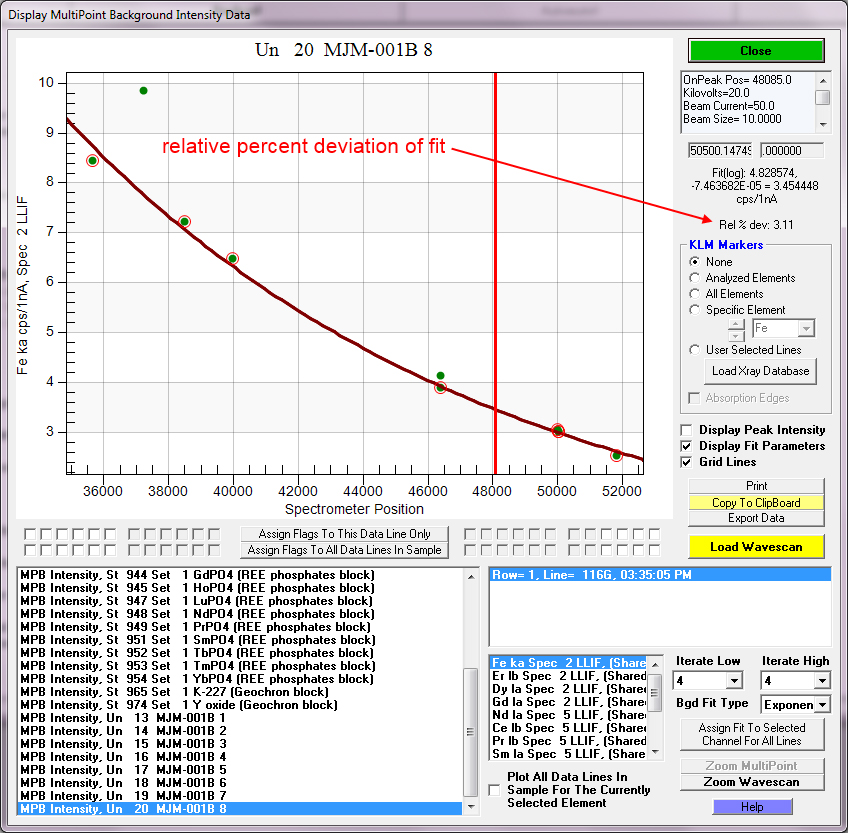 The latest version of Probe for EPMA now displays the relative percent fit deviation in the multi-point background dialog as seen here: