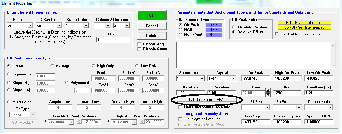 Then when adding elments you can click calculate empirical pha - it will calculate it where intercepts and slopes have been added for that spectrometer, crystal & bias - check using desired bias before clicking