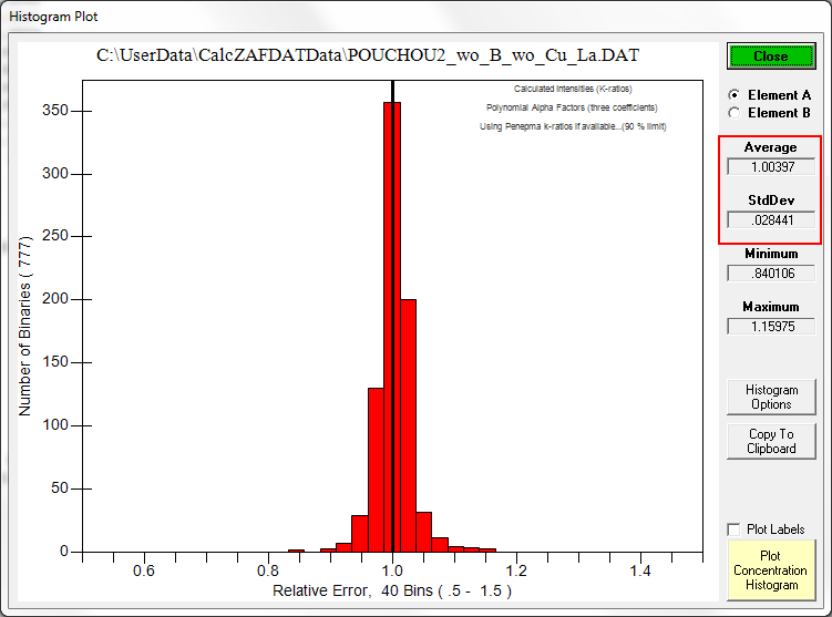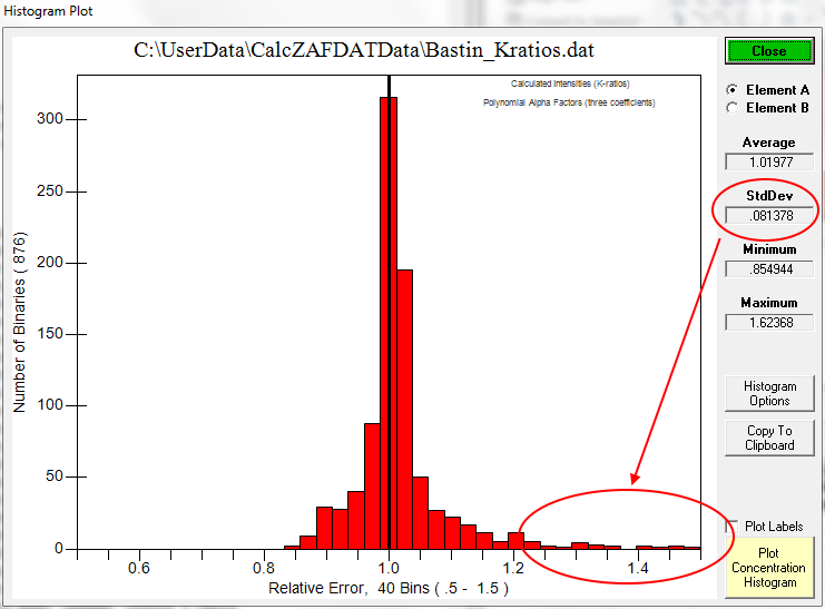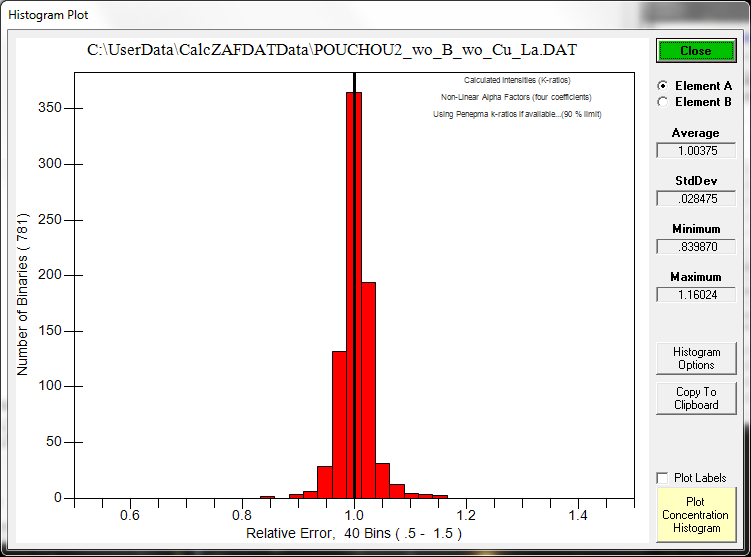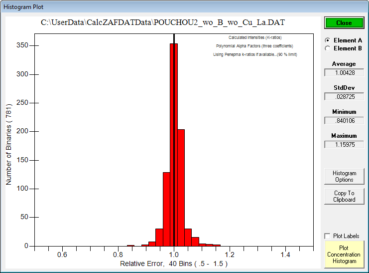 The latest CalcZAF.msi contains a new matrix.mdb k-ratio database with over 367K binary k-ratios from Monte-Carlo calculations that further improves accuracy for the fast Monte-Carlo based matrix corrections.  The previous error histogram from the Pouchou k-ratio database was here (the post just above the non-linear post):