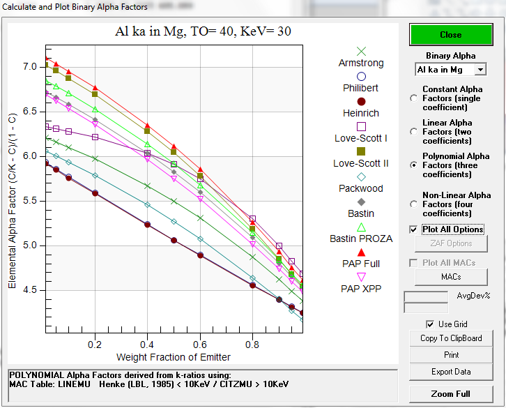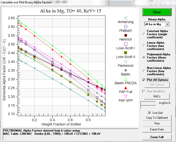 Let's examine one or two of these cases in more detail, for example Al Ka in Mg at 30 keV. Here is a plot of the alpha factors for all analytical expression matrix corrections but first at a more normal 15 keV: