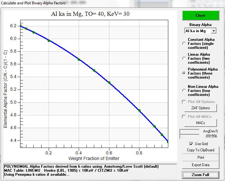 Now let's try the same thing using the Penfluor/Fanal fast Monte-Carlo method on this Bastin k-ratio dataset using polynomial alpha factor fitting: