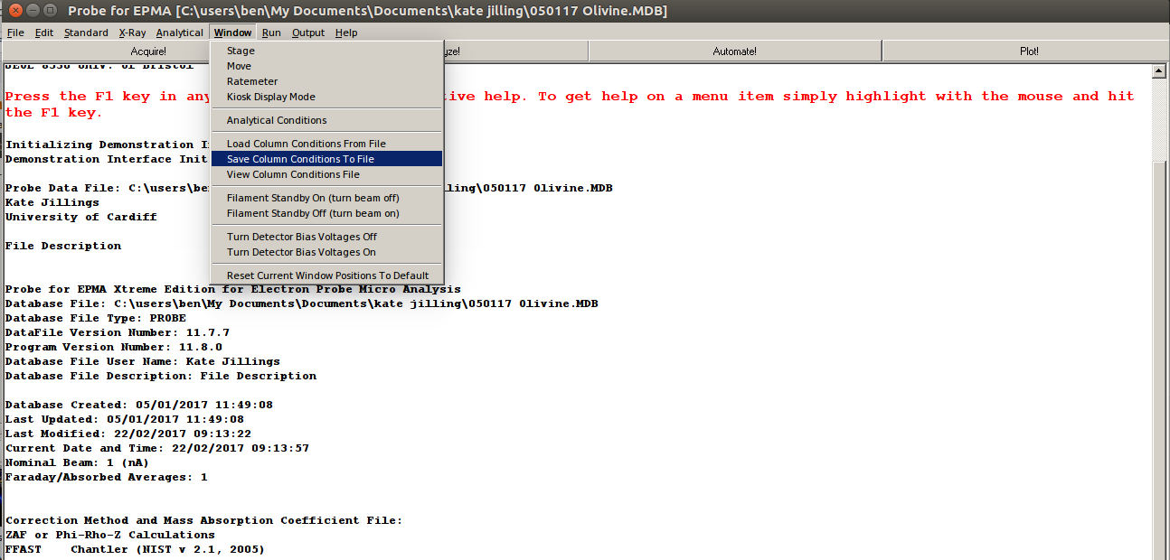 First, when you say the main window, I assume you are talking about the opening window for PfEPMA.  Is this correct?  When I go Window -- Analytical Conditions --  it won't let me save here.  I can 'save' in the combined conditions setup. But when I go to load, the saved conditions are not in the directory.