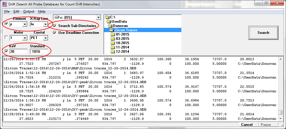 The Drift application is a useful app for monitoring your spectrometer intensities over time.  See the Drift menu in the Start button, Probe Software | Utilities menu. Basically one simply selects a folder tree to search for just an element and x-ray, but one can also constrain it to specific spectrometers and/or standards which is what I did below. Here is a screen shot of the search for Y La intensities on my YPO4 std (1016):