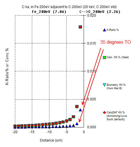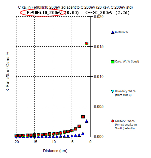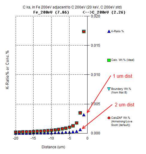 Obviously the above variances are just too large for the non-zero distances so I'm going to continue longer Penepma calculations, but in the meantime, it appears that there is little SF of C K from Fe and Ni as the 1 um boundary distance concentration of C is roughly 0.27 wt%, though again please note the variance is larger than the result, so statistically this is still a zero k-ratio intensity...