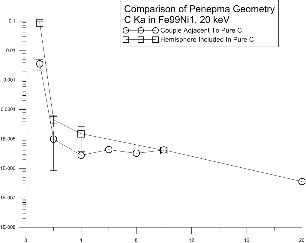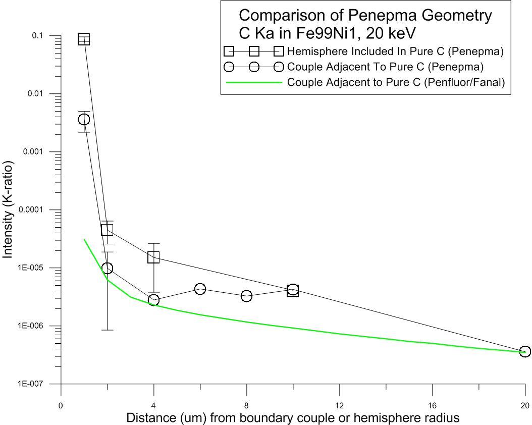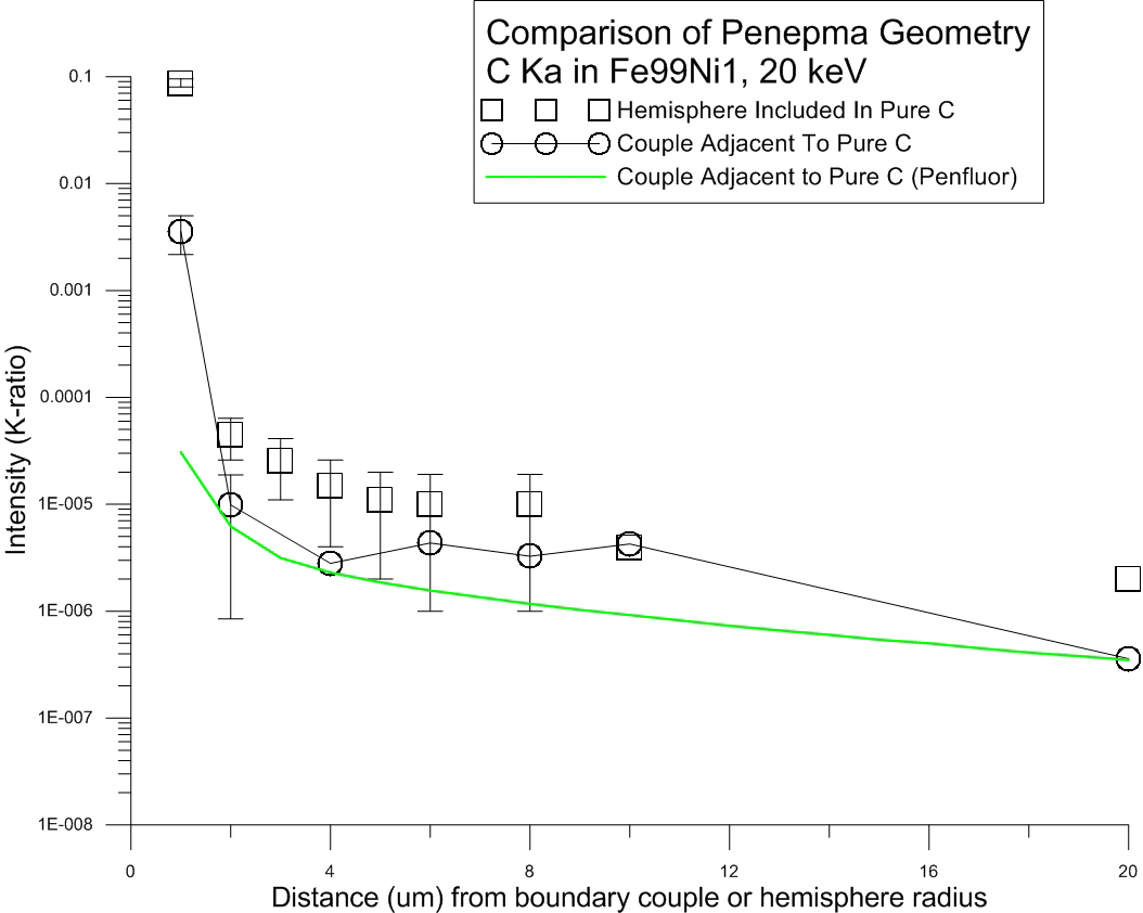 Someone asked to see the Penfluor data plotted up alongside the Penepma data for the C Ka in Fe99Ni1 adjacent to pure C and so here it is.  I added an arrow to show where the 0.5 um k-ratio intensity would plot up, but considering how steep this function is for a very, very absorbing system, the differences aren't as bad as one might think.