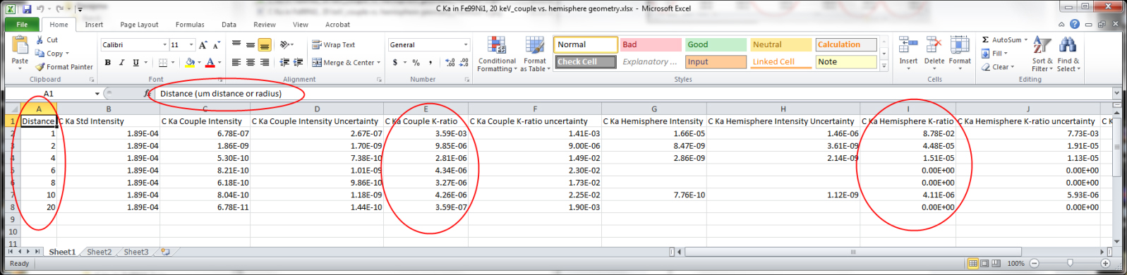 I have attached a file showing a representative setup for creating the input files. The beam incident material is set to glass (the inclusion) with the matrix set to olivine (material I am interesting in calculating SF for). The geometry file is 160mic_sphere.geo and in this example I have set X = 161 (want 1 micron into the olivine from the interface) Y = 0 Z = 1. Assuming these settings are appropriate, I created several of these .in files by incrementing the X-axis beam position to obtain a profile into the matrix and ran them sequentially in batch mode. In addition I have run the same calculation on a bulk geometry (X=Y=0 Z=1) on a synthetic anorthite standard for Ca. I then used the automated "extract k-ratios" tool in the batch mode dialog to calculate the Ca K-alpha k-ratios for the modeled olivine profile, over the anorthite standard. All calculations are for 3600s.