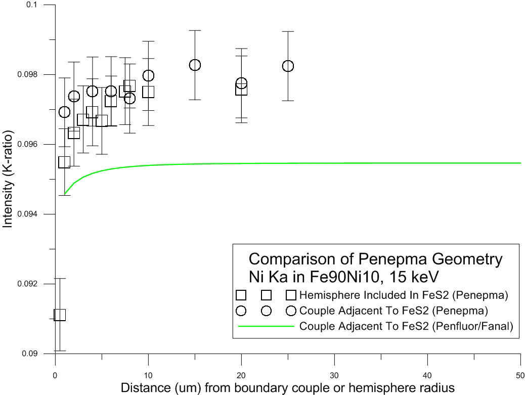 Here are my S ka in Fe90Ni10 at 15 keV comparison between Penepma hemispheres vs. Penepma couples vs. Penfluor/Fanal couples.
