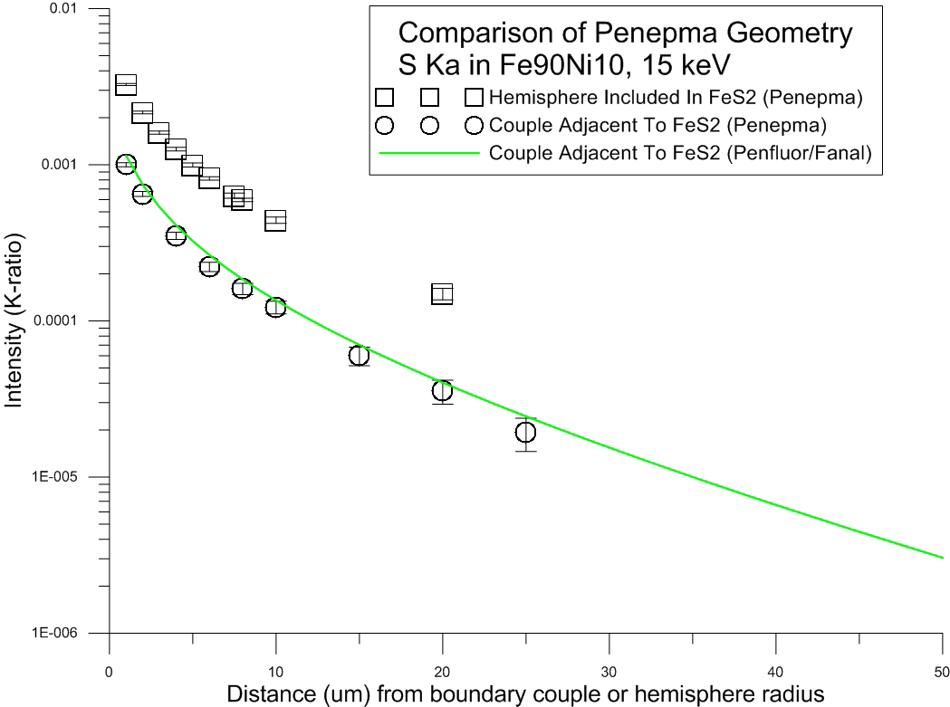 As for the difference in the intensities at less than 2 um? These can probably be explained by the fact that at that distance and with a 20 keV incident beam, you'll get some primary electron scattering into the boundary phase which Penepma will handle properly, while that contribution is neglected in the SF calculation in Fanal. Why? Because Penfluor pre-calculates the PAR files for the primary excitation (and continuum fluorescence) intensities based only on composition- without geometrical considerations in its Monte-Carlo modeling. Fanal then calculates the secondary fluorescence intensities using an analytical model which assumes that all electrons come to rest in the beam incident material. More discussion on this here:
