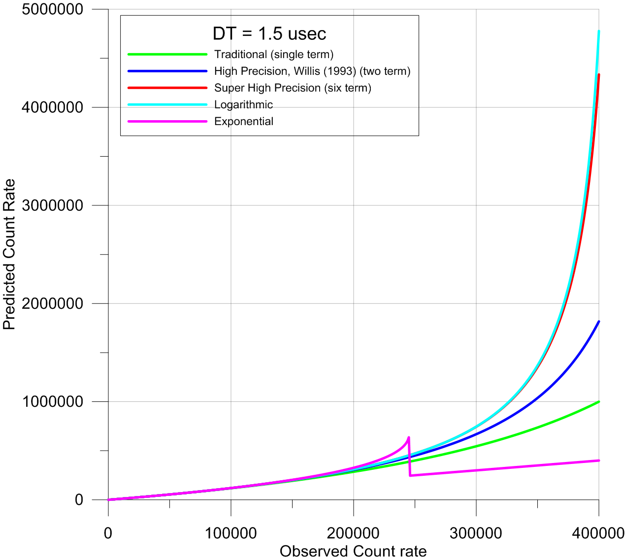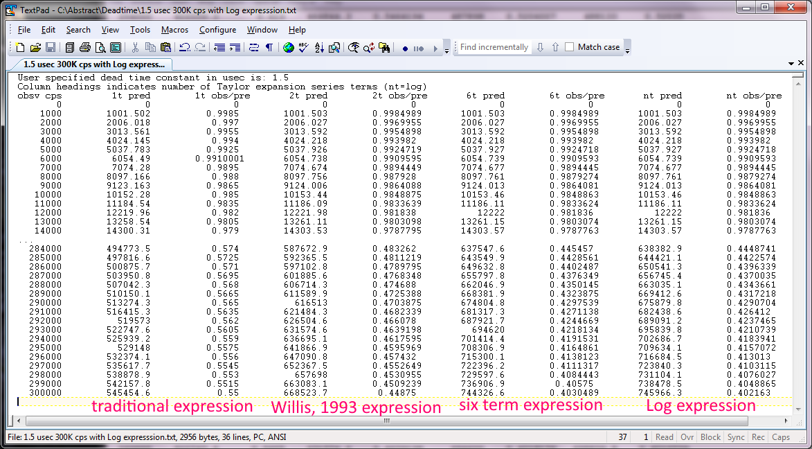 In fact, all the dead time expressions (including the traditional linear expression) fail at sufficiently high dead times and/or count rates, but even the logarithmic expression works up to an input (observed) count of ~420K cps (at 1.5 usec), which corresponds to a predicted count rate of ~2 * 10^8 cps!