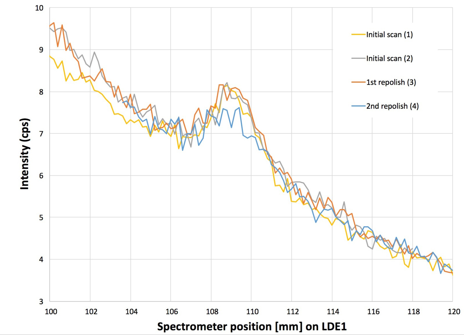 Here is the plot of O Ka in a Pt standards (initial scan is within each of my 2 standards, other scans are after repolishing once or twice one of these standards). In each cases I used 250 or 200 nA, at 15 keV with defocused beam (20 um) and 3 sec counting time by step of 0.2 mm. O Ka peak is at 109.2 mm. The Pt Mz III should be 1.2 mm on the LEFT of the O Ka (so around 108 mm).
