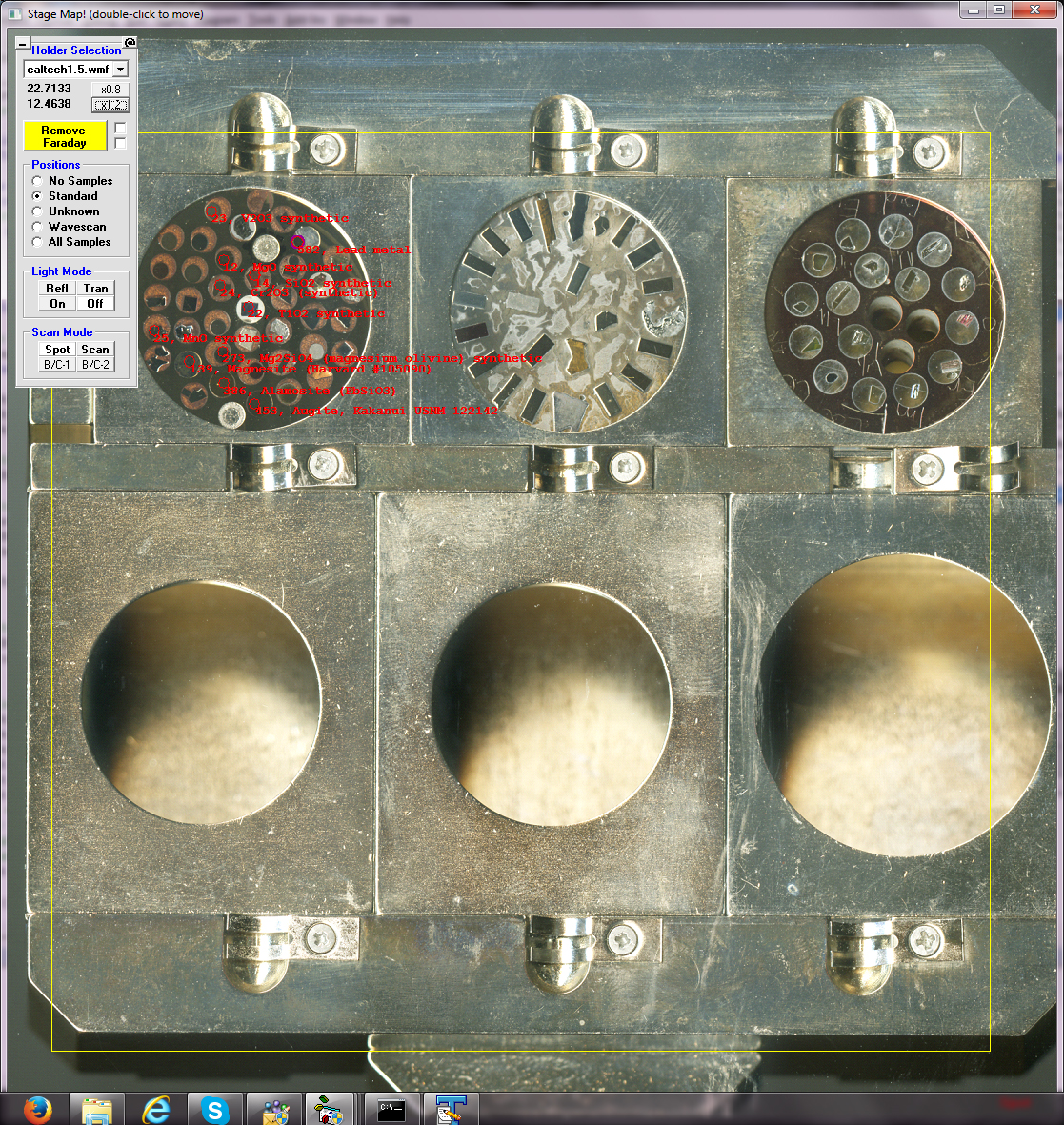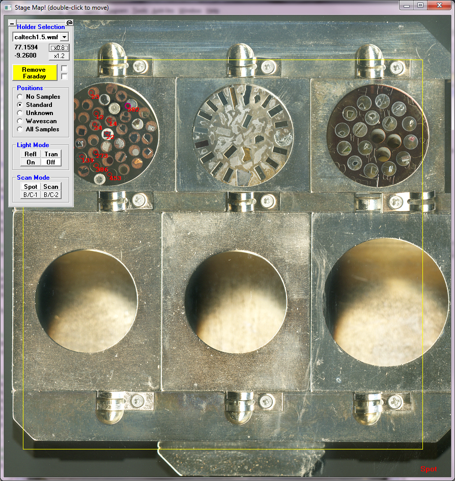 We're using a petrographical light microscope with a motorised stage to pre-program analysis points for our SX100, mainly polished thin sections (on 3x1" glass slides) of rock samples. The control software is called Digimax and made by Microbeam Services, an Australian company. It uses 2 reference positions for X and Y and calculates the Z plane from 3 points from the sample list. We use TEM grids which we stick on the samples as reference markers.