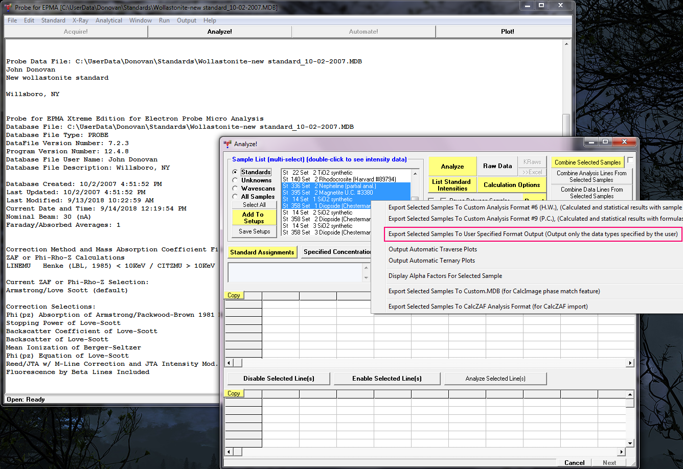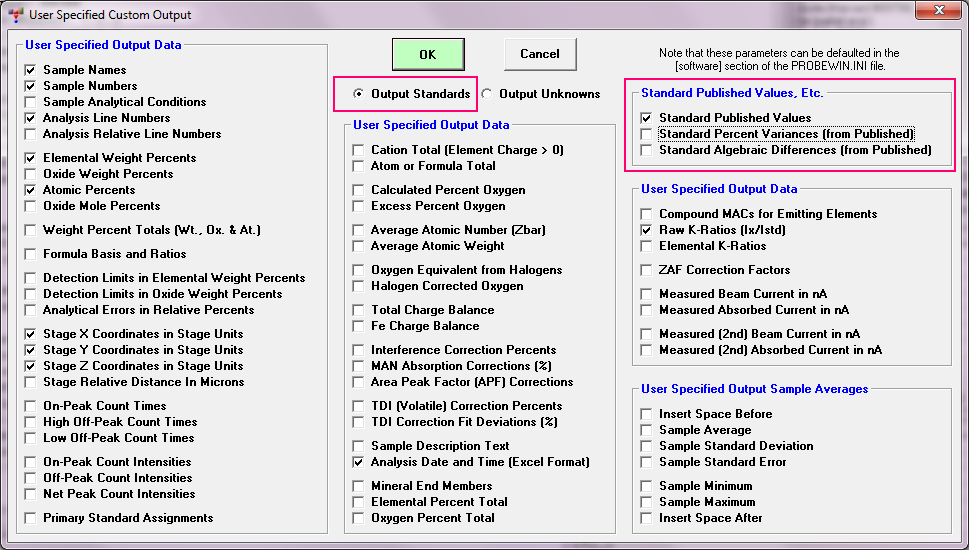 Related to Ben's request above we've modified the code to automatically select the proper sample output type (standard vs. unknown) when the user right clicks the selected sample list in the Analyze! window for the "User Specified Output Format" as seen here: